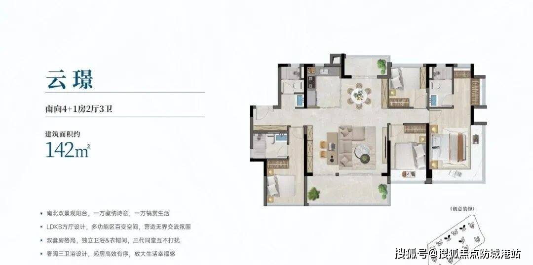建面约142㎡五房两厅两卫,实用率高达115%,是项目的高端改善型户型,也是整个知识城板块内少有的大户型产品。全南向设计,五开间朝南,大面宽采光,客厅宽敞明亮,连接超大景观阳台,视野开阔,能欣赏到凤凰湖的湖景景观;主卧套房设计,带独立卫生间、衣帽间和飘窗,空间宽敞,舒适度极高,能满足高端改善家庭的居住需求;四个次卧空间充足,可作为儿童房、老人房、书房或多功能房间,满足家庭成员的多样化需求;厨房采用U型设计,操作空间充足,配备品牌厨电,方便家人烹饪;两个卫生间干湿分离,设计高端,使用起来更加便捷。