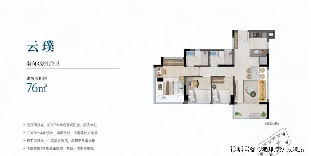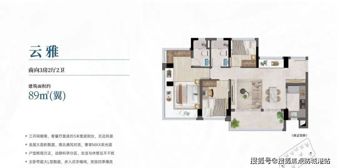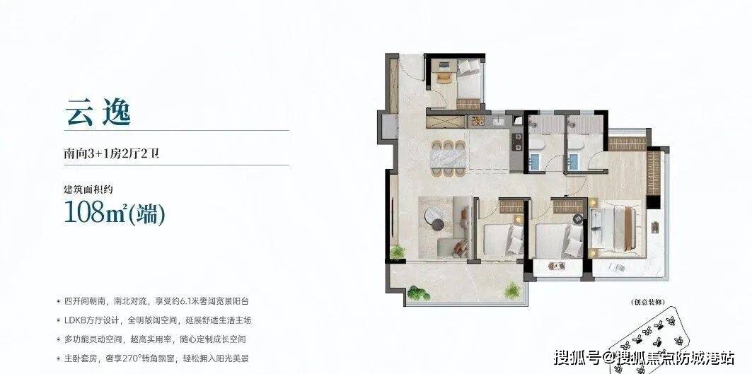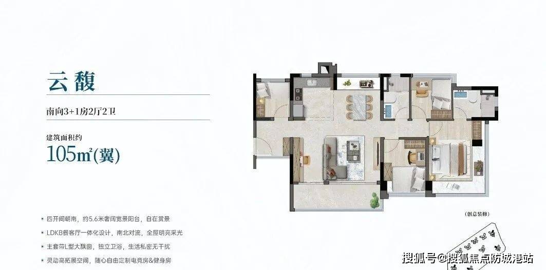 建面约106㎡四房两厅两卫,实用率超110%,是多孩家庭的首选户型。全南向设计,五开间朝南,采光充足,空间布局灵动,拓展空间丰富。客厅宽敞明亮,连接大景观阳台,餐厅与厨房相连,形成LDK一体化设计,方便家人用餐和互动;主卧套房设计,带独立卫生间、衣帽间和飘窗,私密性强,舒适度高;三个次卧空间充足,可作为儿童房、老人房或书房,满足多孩家庭的居住需求;两个卫生间干湿分离,避免了家人使用时的拥挤,提升了居住舒适度。